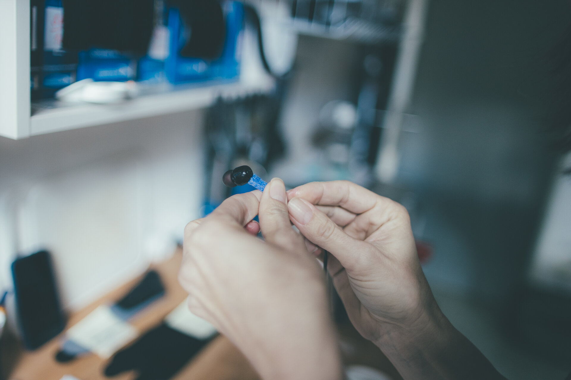 - Zkuste využít vlastní tělo nebo předměty kolem sebe jako opěrnou plochu při manipulaci se sluchátky.