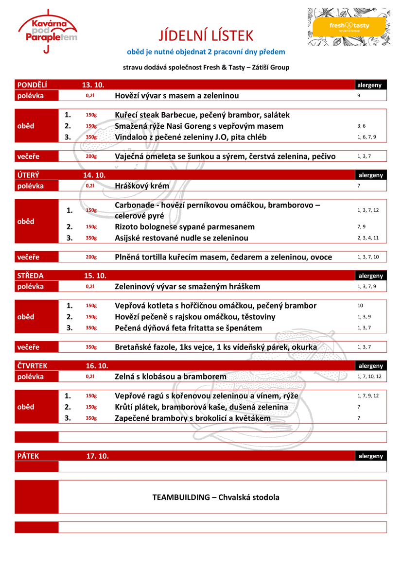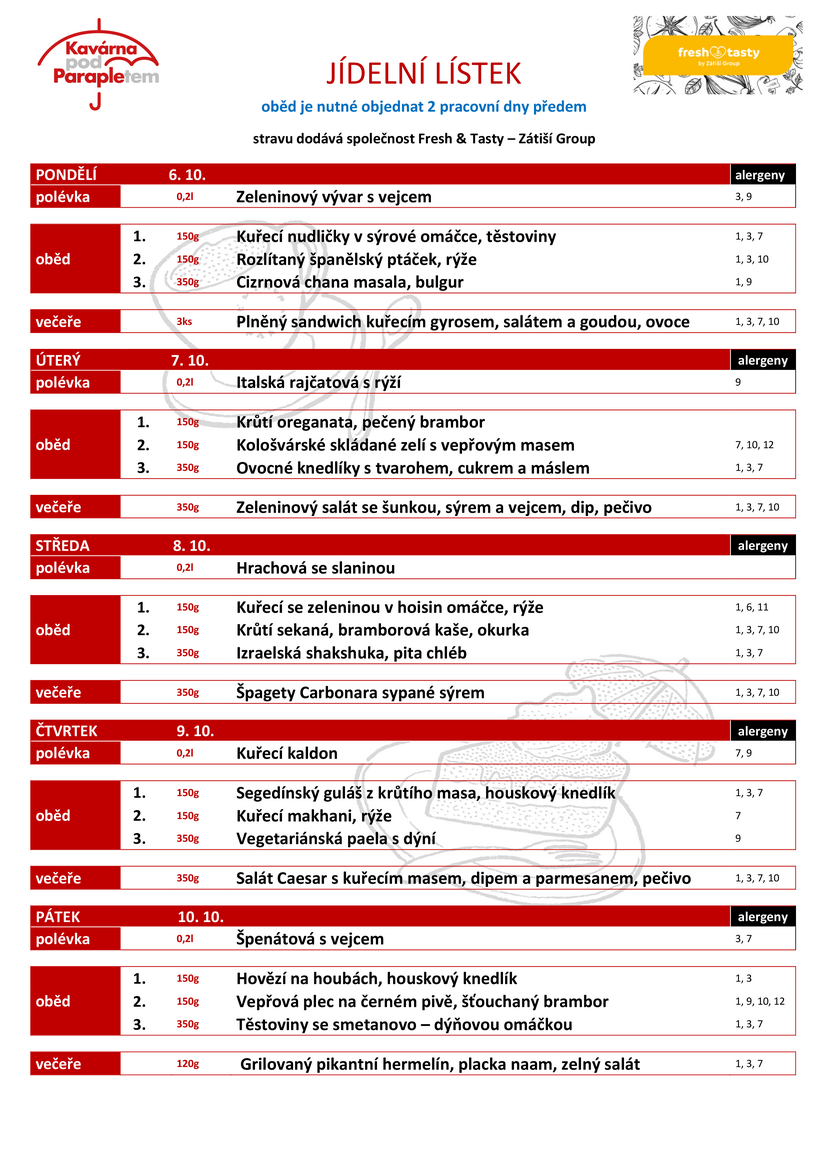 Zakoupit si v naší kavárně můžete čerstvé dezerty, saláty apod. a dále také teplé a studené nealkoholické nápoje, pivo, víno, cukrovinky aj. Stravování se objednává a odhlašuje vždy minimálně 2 pracovní dny předem (do 12:00 hod.), a to osobně, e-mailem na adrese alena.jedlickova@paraple.cz nebo telefonicky na čísle 274 001 310. Virtuální prohlídka Kavárny pod Parapletem na Google Maps.