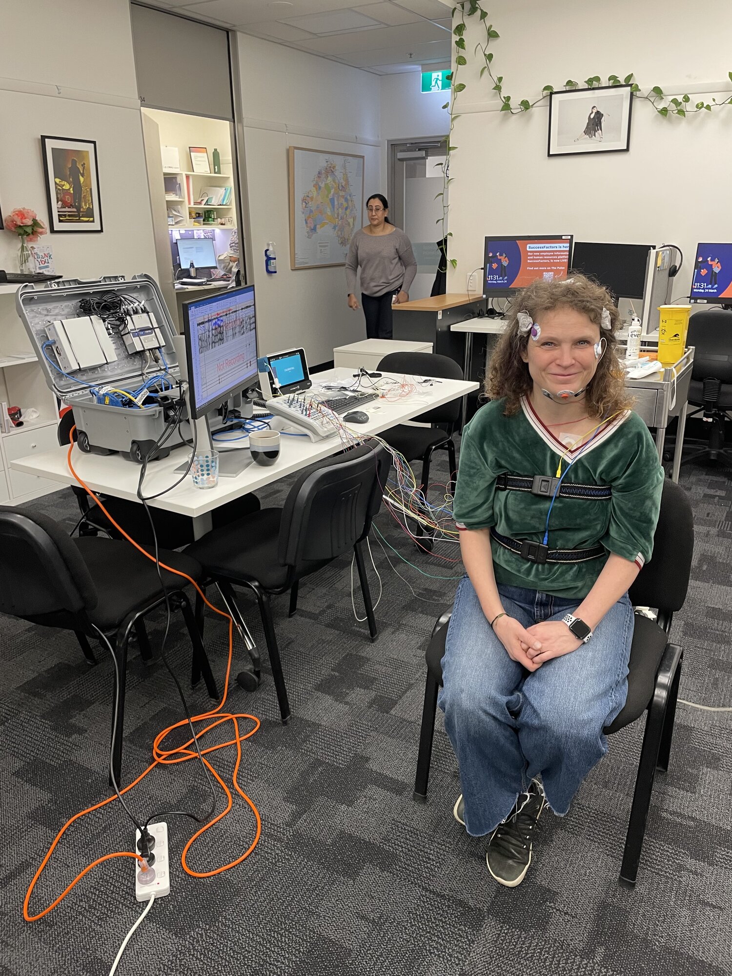 Jako stážistka jsem měla každý den trochu jiný. Měla jsem možnost vyzkoušet si na vlastním těle různá testování, pozorovat práci kolegů, ale hlavně proniknout do studií. Součástí toho byly také výjezdy se spánkovou laboratoří za klienty se sníženou mobilitou v Melbourne a okolí přímo k nim domů.