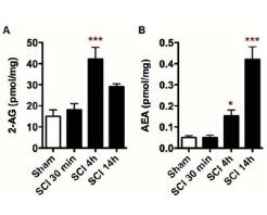 Hladina 2AG, posla CB2 receptorů zodpovídajícího za imunitní odpověď, se mírně zvyšuje už 30 minut po poranění míchy. Během prvních 4 hodin od poranění a ještě 14 hodin po poranění je dvojnásobně vyšší.Anandamid, posel CB1 receptorů, který v tomto případě plní roli v ochraně a regeneraci nervů, stoupá pozvolněji, ale i jeho hladiny se zvyšují několikanásobně.